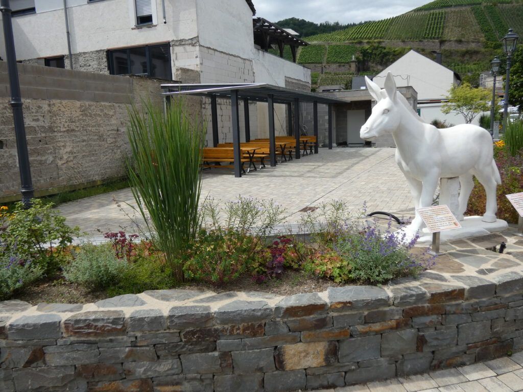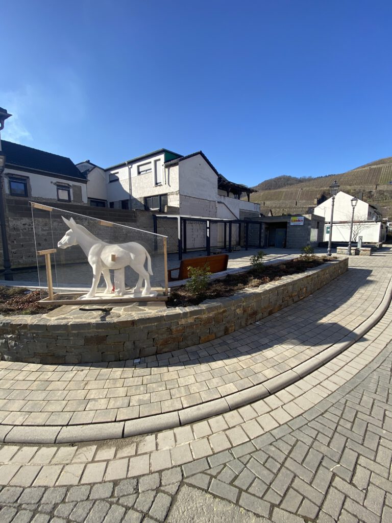 Der Dorfplatz war vor der Flut ein beliebter Treffpunkt und bildete zusammen mit der nahegelegenen Bäckerei und dem EDEKA-Markt eine zentrale Anlaufstelle für Jung und Alt. Die Fläche wurde zudem für Feste und Veranstaltungen genutzt und besonders der steinernde „Esel“ galt als beliebtes Fotomotiv.