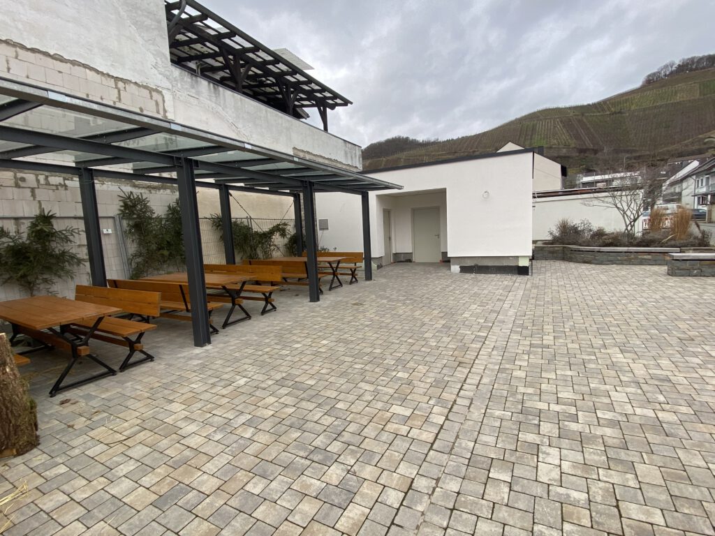 Die Ortsgemeinde Dernau hat beschlossen, dass dieser Platz den Gegebenheiten angepasst und wieder neu aufgebaut werden soll. Die Tiefbauarbeiten wurden Ende 2023 abgeschlossen. Außerdem wurde die Bepflanzung erneuert, die Sitzauflagen aus Holz angebracht sowie die Beleuchtung installiert. Im Februar 2025 erfolgte der Bau der neuen Pergola. Darüber hinaus wurde ein WC-Gebäude errichtet, welches keine Wiederaufbaumaßnahme darstellt.