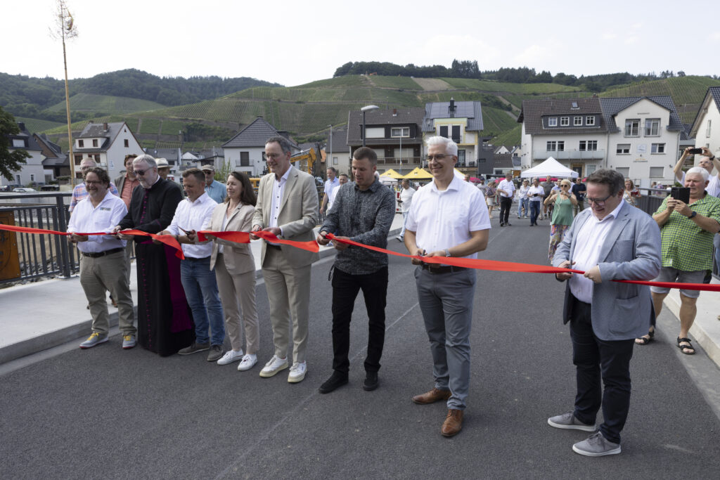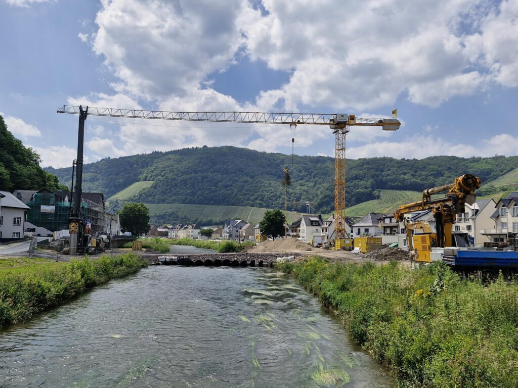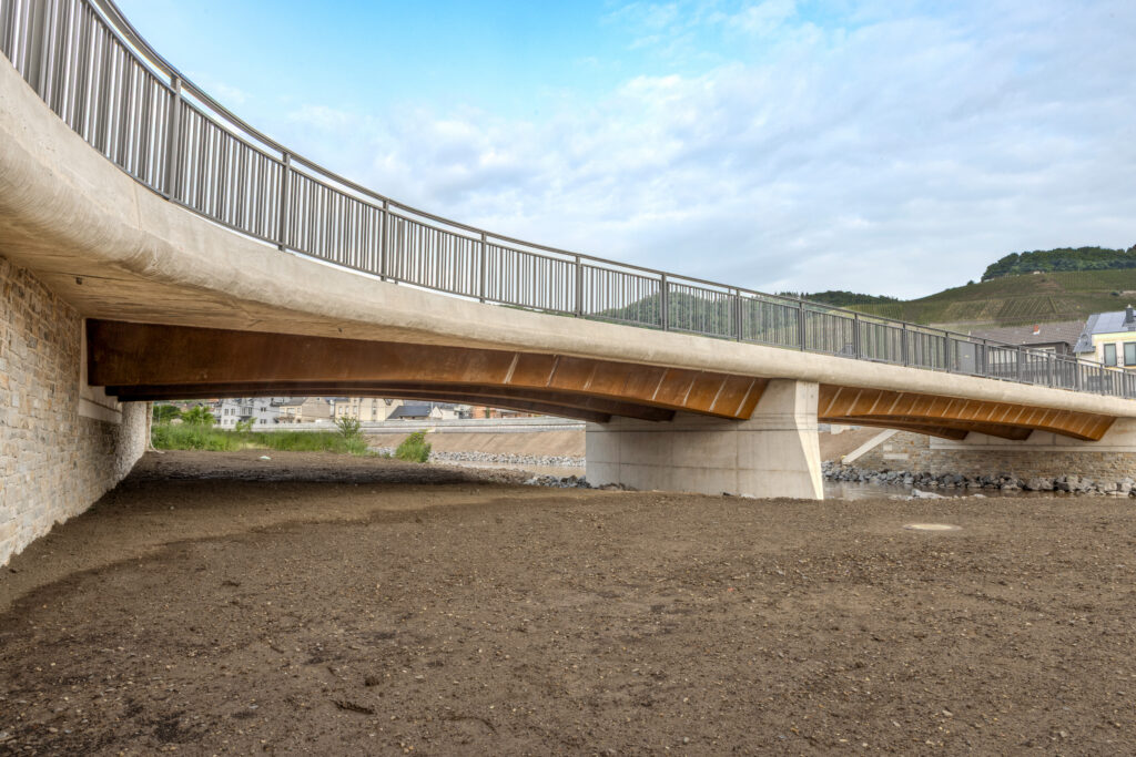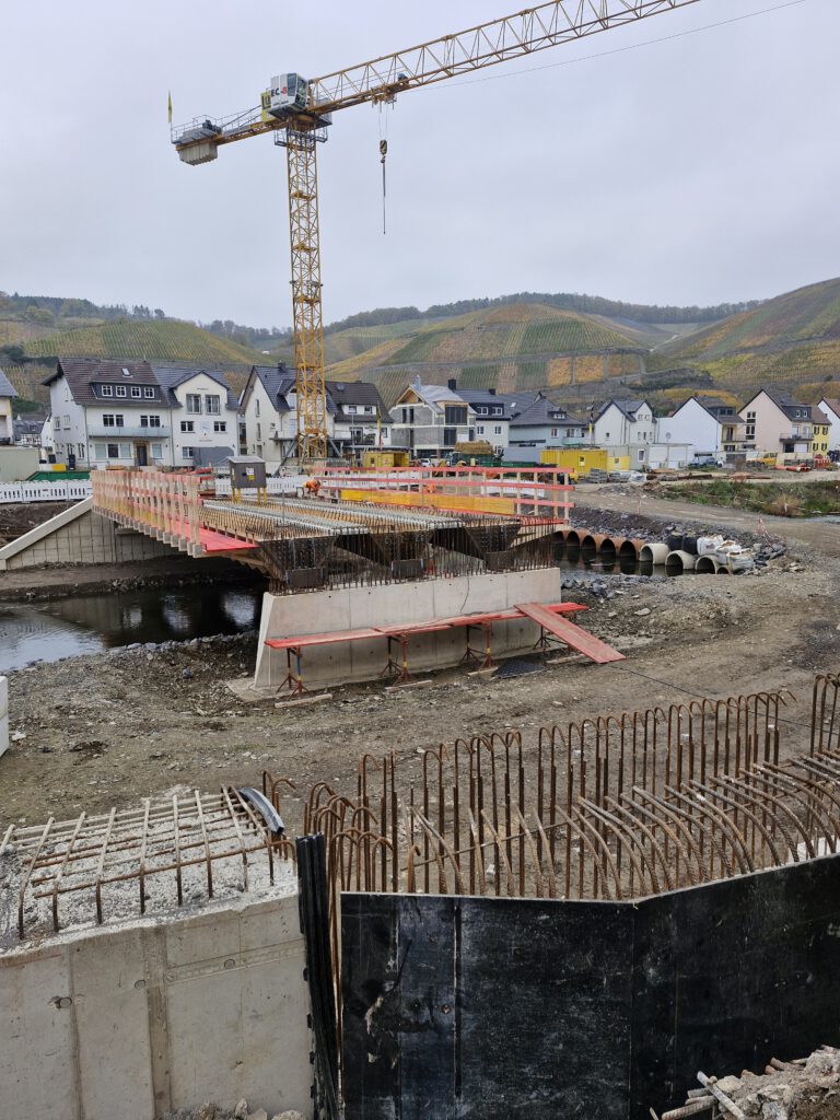 Die Weinbaubrücke wurde am bisherigen Standort wiedererrichtet. Dabei wurde das Bauwerk bewusst überströmbar gestaltet und entsprechend gegründet, um bei künftigen Hochwasserereignissen eine höhere Resilienz zu gewährleisten. Zudem wurde der Brückenpfeiler entsprechend dem Strömungsverhalten der Ahr ausgelegt. Die Umsetzung erfolgte in enger Abstimmung mit der Oberen Wasserbehörde SGD Nord.