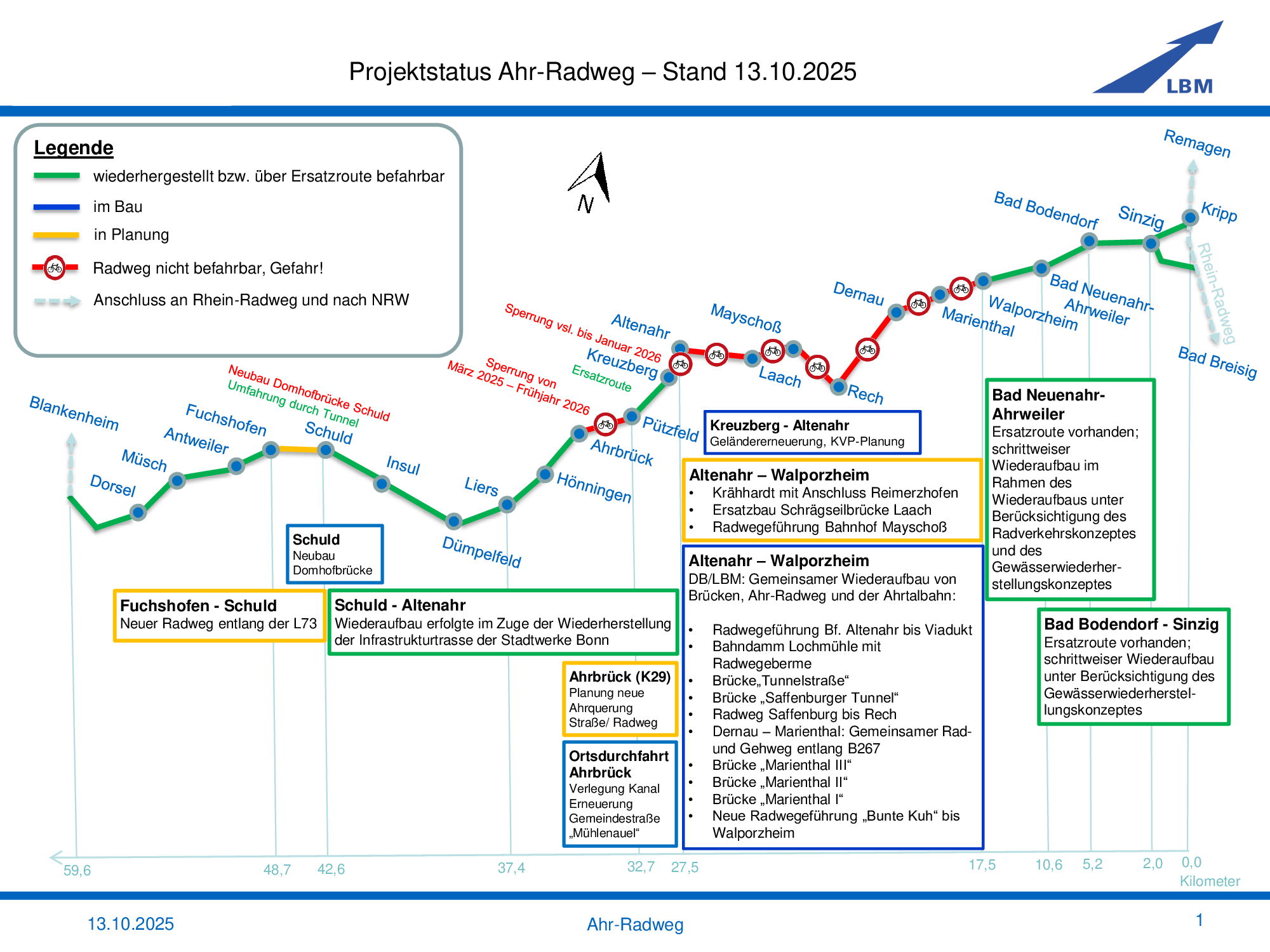 Die Planungen für den Wiederaufbau des Ahr-Radweges werden durch ein Projektbüro des Landesbetriebs Mobilität (LBM) vorangetrieben. Alle weiteren Informationen finden Sie unter www.lbm.rlp.de/grossprojekte/wiederaufbau-ahrtal.